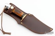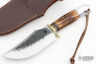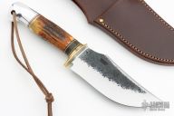 This Hunter by Rocco Handmade features a satin finished hollow ground blade with hammer marked flats, .186" blade stock and 2" blade depth, hidden tang construction. The handle features a brass guard, red/micarta/yellow/brass spacers, and a stag grip with aluminum buttcap with lanyard hole. Great look and feel. Comes with a Treeman brown leather sheath. New from maker at the 2023 Atlanta Blade Show!