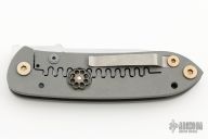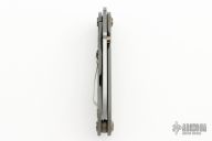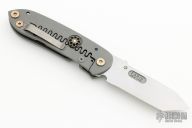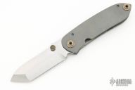 This T-1000 by Farid Knives features a satin finished chisel ground blade with a single thumbstud.  The handle has a bead blasted titanium frame with a titanium clip and bronzed hardware. Nice detent, blade seating, and lockup. Has a stainless lockface insert and a titanium barrel spacer. New from maker at the 2023 Blade Show.