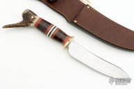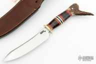 This Fighter by Jim Behring features a satin finished upswept convex ground blade with false top edge, .21" blade stock and 1.31" blade depth, hidden tang construction. The handle features a brass guard, black/red/white spacer pattern, horsehide stacked leather, and pinned vintage mule deer crotch stag with brass cap. Great look and feel. Comes with full stitch brown leather sheath. #20. New from maker.
