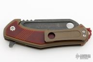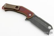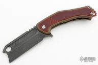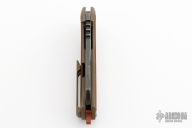 This Orphan by Eric Luther features an acid etch finished blade with milled fullers, hole in blade, notched thumbrest, and flipper. The handle has a tumbled and anodized titanium frame with vintage caramel paper micarta inlays, matching backspacer with lanyard hole, and tip up clip. Comes with zipper case and COA dated 06/01/23. Nice detent, lockup and blade seating. New from maker at Blade Show Atlanta 2023.