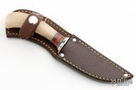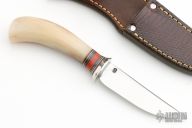 This Trout knife by Jim Behring features a satin finished upswept convex ground blade with .091" blade stock and .764" blade depth, hidden tang construction. The handle features a nickel silver guard, black/gray/red spacer pattern, and a musk ox grip. Comes with brown leather sheath with premium lizard skin panel. New from Maker at the 2023 Blade Show Atlanta!