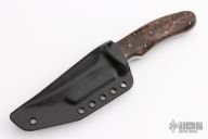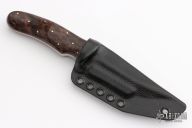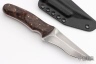 This Kidon by Joe Watson features a satin finished double-edged recurve blade with hamon, .34" blade stock (extra thick) and 1.323" blade depth, full tapered tang construction. The handle has Amboya burl scales and brass pins. Comes with a kydex sheath and zipper case. New from Maker!