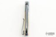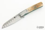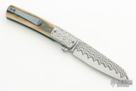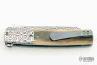 This FR Stretch Flipper by Brad Zinker features a Baldur Damascore blade with checkered thumbrest and flipper. The handle has dovetailed Ladder Damasteel bolsters, mammoth ivory scales, anodized titanium liners with laser engraved interiors and a tip up anodized titanium clip. Rides on bearings, nice detent, lockup and blade seating. Comes with zippered case. New from maker at the 2023 Blade Show.