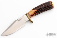 This Classic Blades Trail Guide from Blackjack Knives features a satin finish clip point blade with false top edge, .213" blade stock and 1.405" blade depth, hidden tang construction. The handle is comprised of brass guard with red, white and black spacers, stag handle and a brass butt. Includes a zippered case. Excellent condition.