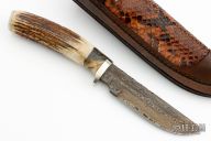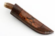 This Skinner by Herb Derr features a Birds Eye Damascus blade with file worked spine, .162" blade stock and 1.051" blade depth, hidden tang construction. The handle is comprised of a nickel silver guard and pommel with buckeye burl and nickel silver spacer and a stag grip. Includes a brown leather sheath with boa skin inlay. Comes with COA. New from maker at the 2023 Blade show.