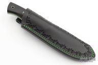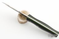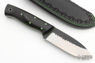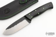 This Musk Ox by Warlander Enterprises features a flat ground drop point blade with hammer mark flats, .127" thick blade with 1.439" blade depth, full tang construction. The handle has bog oak scales with black liner, lime green pins/pinstripe, and stainless steel lanyard hole. Excellent fit and finish. Comes with a leather sheath, zipper case, and COA. New from Maker at the 2023 Bladeshow.