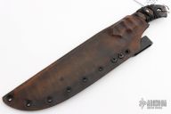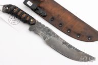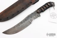 This knife by DG Blade Co features a hand forged blade with notched thumbrest, .238" blade stock and 1.705" blade depth, full tang construction. The handle has a ronin wrap with wood liners. Comes with a wet formed leather sheath with belt clip. New from Maker!