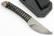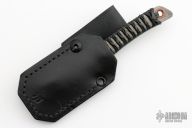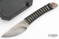 This forged knife by DC Munroe features a hand rub finish blade with forge finished flats, .204" blade stock, and .985" blade depth with full tang construction. The handle has a copper lanyard liner, leather wrap. Has a Munroe Metalworks stamp in the ricasso. Comes with handmade leather sheath with belt loop. Excellent condition.