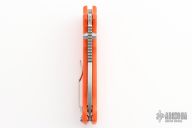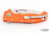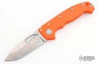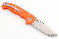 This AD20 by Andrew Demko features a stonewashed blade with thumbhole, notched thumbrest and dual thumbstuds.  The handle has an orange G-10 frame with a tip up stainless steel clip and "Shark" lock release on the spine. Comes with original box. Excellent condition.