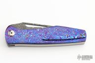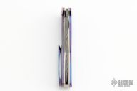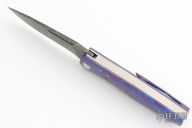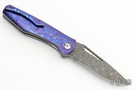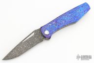 This Umpqua Scale Release D/A Auto from William Tuch features a Damascus blade with thumbhole. The handle has timascus scales, textured titanium liners with jeweled interiors, matching titanium backspacer, mother of pearl inlay in the pivot, tip up timascus clip. Nice detent, lockup and blade seating, strong action. Comes with a zippered case. Excellent condition.
