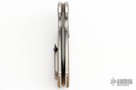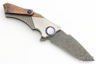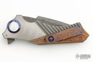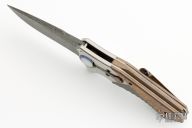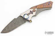 This knife is originally from one of the TKI shows, Necromonger by Allen Elishewitz. Features a Chad Nichols stainless Damascus blade with false top edge and gold medallion in flipper tab. The handle has a milled titanium frame, mokuti inserts, raised mokuti backspacer, anodized titanium pivot surround, mokuti E-lock and tip up clip, mother of pearl pivot inlay, mokuti tip up clip with roller ball. Nice detent, lockup and blade seating. Comes with nylon velcro case. Has 3 Sapphires set in 14kt gold bezels. Excellent condition.