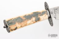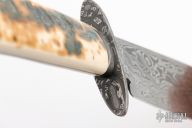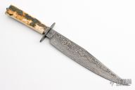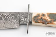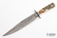 This Bowie by Master Smith Don Hanson III features a clip point Damascus blade with false top edge, .222" blade stock and 1.521" blade depth, mortise tang construction. The handle has a mosaic Damascus guard and collar, beautiful mammoth ivory grip with gold pins, Damascus butt and finial. Comes with a zippered case. Excellent condition. Really a stunning piece.
