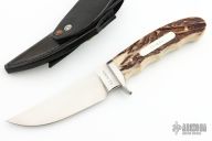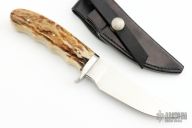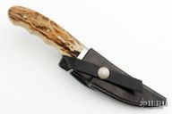 This stag hunter by DE Henry features a hand rub satin finished upswept blade, .187" blade stock and 1.170" blade depth, hidden/mortise tang construction. The handle has a stainless steel guard and a two-piece stag handle with nickel silver pins and escutcheon. Comes with a black leather sheath and a zippered case. Has a few light scratches, otherwise excellent condition.