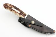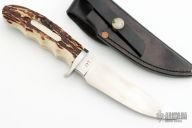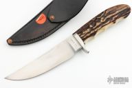 This stag hunter by DE Henry features a hand rub satin finished upswept blade, .254" blade stock and 1.324" blade depth, hidden/mortise tang construction. The handle has a stainless steel guard and a two-piece stag handle with nickel silver pins and escutcheon. Comes with a black leather sheath and a zippered case. Has a few light scratches, otherwise excellent condition.