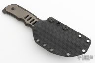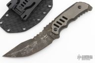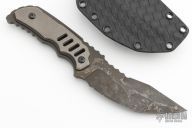This Mitrulol by TASKnives features an acid etched Z-Wear Blade with a notched thumbrest and false top edge, .210" blade stock and 1.397" blade depth, full tang construction. The handle has layered titanium scales. Comes with basketweave kydex sheath. 60-61HRC. New from maker at the 2023 Blade Show!