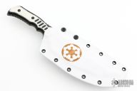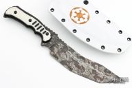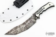 This Mitrul by TASKnives features an acid etched 3V Blade with a notched thumbrest and false top edge, .24" blade stock and 1.799" blade depth, full tang construction. The handle has layered g10 and titanium scales. Comes with kydex sheath. 60-61HRC. New from maker at the 2023 Blade Show!
