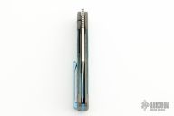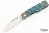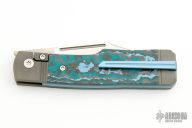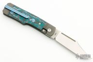 This Gunslinger Jack is a gunstock front flipper model by Jack Wolf Knives featuring a satin finished clip point blade with fuller. The handle has integral bead blast finish pinched and fluted titanium front and rear bolsters and liners, Fat Carbon inlays, anodize finish backspacer, and titanium tip up clip. Has filler tab for clip. Comes with box, metallic tube with Sean Tiffany artwork, sticker, pog, and microfiber cleaning cloth. New condition.