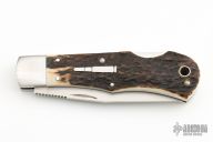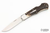 This Remington 1306 Lockback by Mike Zscherny features a hand rub satin finished blade with a nail nick and notched thumbrest. The handle features 416 stainless steel bolsters, escutcheon and liners, stag covers, stainless steel backspacer. Comes with a zippered case and COA. New from maker at the 2023 Blade Show.