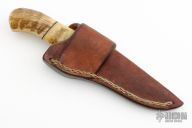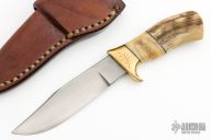 This One Off Camp Knife by Ed Fowler features a clip point blade with convex ground bevels, .273" blade stock and 1.301" blade depth, hidden tang construction. The handle has an engraved brass guard, sheep horn grip with sheep horn and black spacers. Comes with a brown leather sheath and a zippered case. Excellent condition.