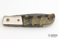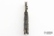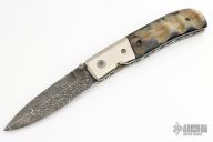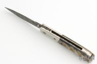 This linerlock folder by Charles H Morris features a Cable Damascus blade with a false top edge and single checkered thumbstud. The handle has dovetailed and orange peel finished titanium bolsters, kudu horn scales, orange peel finished and fileworked titanium liners and an orange peel finished titanium backspacer. Has nice detent, lockup and blade seating. Excellent condition.