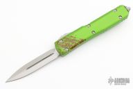This Zombie Ultratech by Microtech Knives has a D/E satin and bead blasted double-edged blade with fullers. Handle is green aluminum with red splatter pattern. Stainless steel glass breaker and tip up clip. Comes with a zippered case. Excellent condition.