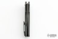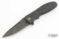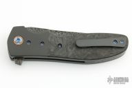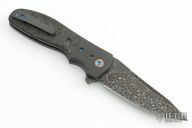 This Blitz flipper by Kirby Lambert features a Bertie Rietveld Dragonskin Damascus blade with notched flipper. The bolsters are zirconium, marble carbon fiber scales,  anodized titanium hardware, anodized and bead blasted titanium liners, zirconium tip up clip, copper pivot collars. Blade is centered when closed, flips well with no wrist action needed, and solid lockup. Excellent condition. Comes in a zippered case.