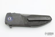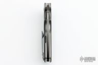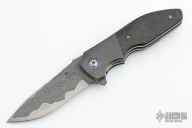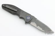 This RAINE Flipper by Kirby Lambert features a Chad Nichols Armor CoreSan Mai Damascus blade with notched thumbrest and flipper. The handle has zirconium bolsters with mokuti pivot collars, marble carbon fiber scales, textured titanium liners, carbon fiber backspacer, Zirconium tip upclip. Excellent condition. Comes with zippered case.
