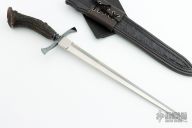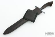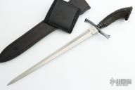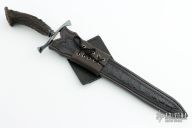 This Dagger by Ron Frazier features a hand rub satin finished double edged blade with .240" blade stock and 1.088" blade depth, hidden tang construction. The handle has a blued steel guard and a crown stag grip. Comes with a black leather sheath with alligator skin inlay. Excellent condition. Stunning!