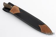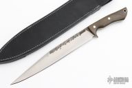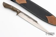 This bell Bowie by Lon Humphrey features a hand forged blade with satin finished grinds and forged finished flats, has false top edge, .189" blade stock and 1.373" blade depth, full tang construction. The handle has green canvas micarta scales with stainless steel pins and lanyard tube. Comes with a brown leather sheath. Excellent condition.