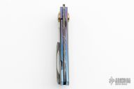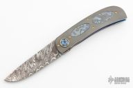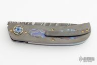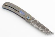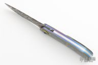 This LL-H Front Flipper by George Muller features a Chris King Damascus blade with a notched front flipper. The handle has zirconium scales black timascus inlays, anodized titanium liners, zirconium tip up clip and a stainless steel backspacer, gold plated screws. Features IKBS, nice detent, lockup, action and blade seating. New from maker. Comes with original box, zippered case and COA.