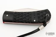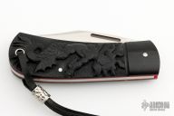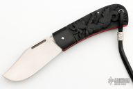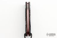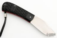 This Bad Guy by Franck Souville features a hand rub satin finished blade with nail nick. The handle has fluted and carved black G-10 covers with red G-10 liners, stainless steel spring. Nice strong spring, nice blade seating. Excellent condition.