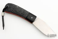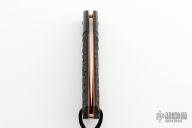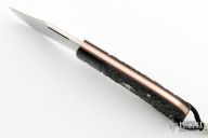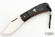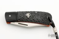 This Bad Guy by Franck Souville features a hand rub satin finished blade with nail nick. The handle has fluted and carved black G-10 covers with orange G-10 liners, stainless steel escutcheon and spring. Nice strong spring, nice blade seating. Excellent condition.