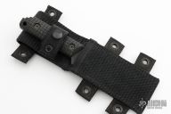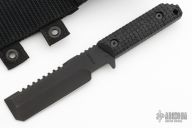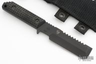 This Strider PP Tool features a sharpened main edge and a partially ground "pry tip" on the leading edge with saw teeth and notched thumb rest on the spine. The handle is comprised of black Monkey Edge frag pattern G-10 scales over full tang construction. Lanyard hole in pommel. Includes kydex sheath with velcro belt loop. Monkey Edge and Strider Knives logo on the "B" side of the blade. Excellent condition.