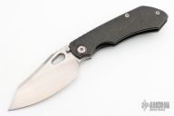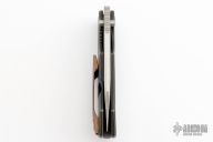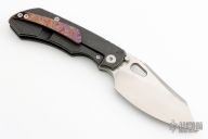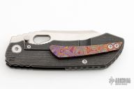 This Evolution 3.0 by Custom Knife Factory features a satin finished blade with notched thumbrest and thumbhole. The handle has a stonewashed bark finished titanium frame with a backspacer. Timascus pivot collars and clip. Comes with velcro case, additional clip, and COA. Nice detent, lockup and blade seating. Excellent condition. #725 and dated 8-22.