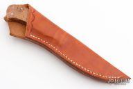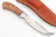 This custom fixed blade by Ron Gaston features a double-edged hand rubbed satin finish blade, full tapered tang construction with .144" blade stock and .986" blade depth. The handle has satin finish stainless steel dove tailed bolsters, Spalted Maple scales. Comes with a brown leather sheath. Excellent condition.