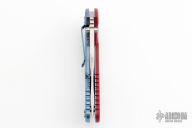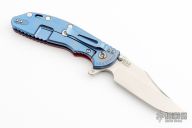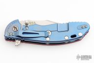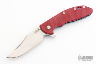 This XM-24 by Rick Hinderer features a tumble finished clip point blade with swedge, dual thumb studs, notched thumb rest and flipper. The handle is comprised of a textured red G-10 scale over titanium liner on the "A" side and a tumbled titanium and anodized lock side over titanium barrel spacers. The tumbled titanium pocket clip is reversible for tip up/down, right hand carry. Comes with extra bushings. Excellent condition.