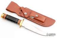 The Hattori SAN-31 Limited Bowie Knife is modelled after a famous S.O.G. knife from the Vietnam war era and has a 6-1/4" hollow ground, semi-mirror polished V-Gold San-Mai stainless steel Bowie-style blade, with a large false edge on the back of the clip point. Elegant and simple, the 4-3/4" "STAY-GOLD Edition" Custom Combination Handle is a real modern beauty (Leather Washer / Brass / Quince Burl Wood / Black Micarta) that features a solid Brass Double Guard / Crossguard and Butt Cap (With Lanyard hole). The knife comes with a Brown leather sheath (With a sharpening stone inside the pocket) and the Gift box has a special Sanjyu ("80-year anniversary") gold label and message.
