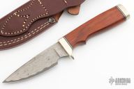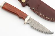 Hattori SAN-36 Limited HD Damascus Hunter 4" Spear point V-Gold core forge 97 layered Nickel & Stainless Damascus blade with swedge on back, 4.4" Distinctive Cocobolo Wood handle with Nickel Silver hilt and butt. Comes with Double stitched Brown leather sheath, and Presentation Gift box with "Sanjyu 80 year anniversary message and gold label.