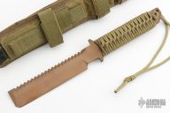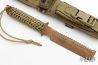 This ED CuBe EOD Knife by Strider features a copper beryllium blade with serrated spine, .274" blade stock and 1.294" blade depth, full tang construction with tan paracord wrapped handle. Comes with a nylon sheath. Excellent condition.