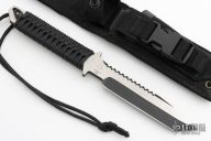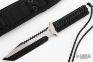 This BT SS from Strider features a two-tone clip point tanto style blade with serrations on the spine, .242" blade stock and 1.308" blade depth. The handle is comprised of black paracord wrap over full tang construction with a lanyard hole. Includes nylon sheath with belt loop. Excellent condition.