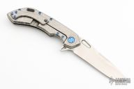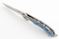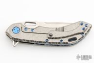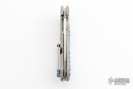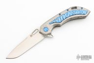 This Wayfarer 247T from Olamic Cutlery features a satin finished tanto blade with swedge, thumb hole, notched thumb rest and flipper. The titanium handle scales are frosty finished titanium with matching pocket clip is positioned for tip up carry, raised ti blue nugget anodized and floating anodized titanium backspacer. The Wayfarer 247 is very comfortable in the hand and flips well with no wrist action needed. Blade is centered when closed and locks up with no play. Comes with zippered case and maker's card with a serial number of T394T. Excellent condition.