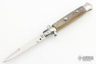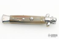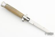 This Swivel Bolster Auto features a polished bayonet blade. The handle has stainless steel bolsters and butt, honey horn scales, brass liners. Excellent condition.