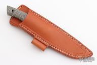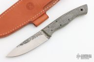This knife by Fiddleback Forge features a drop point blade with forged finished flats, .124" blade stock and 1.12" blade depth, full tang construction. The handle has black Oreo burlap micarta scales with black/yellow G-10 liners.  Includes a brown leather sheath and the original box.  Excellent Condition.