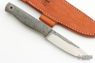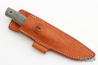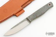 This Terrasaur by Fiddleback Forge features a drop point blade with forged finished flats, .158" blade stock and 1.031" blade depth, full tang construction. The handle has oreo micarta scales with brown/yellow liners.  Includes a brown leather sheath and the original box.  Excellent Condition.