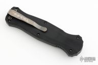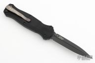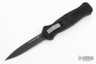 "Introducing an OTF like none-other.. The new Infidel® is rapidly making believers out of many a skeptic. Built for strength and reliability the patent pending double-action mechanics get it done over the long haul. Grab on and you will find the handle grip rock-solid with its patented machined in Presidio® style bi-directional tread pattern, and overall generous sizing for gloved hands. Intuitively pressure the release-slide forward and its spear-point edged steel fires and locks up with a unique three-point retention system with amazingly negligible blade play. Reverse the process and the blade retracts in a rapid blur of motion. The Benchmade Infidel is a special operator’s fantasy come true." Includes original sheath and papers. Excellent condition.
