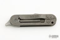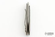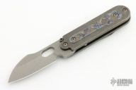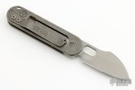 This Bean Cleaver folder by Serge Panchenko features a stonewashed cleaver style blade with front flipper/friction bar and thumb hole. The handle is stonewashed titanium with laser engraved inlay and a tip up clip. Has a detent to hold the blade in position open/closed, but it does not lock. Comes with original card. Excellent condition.