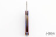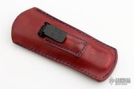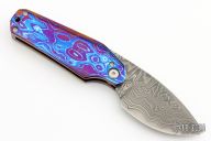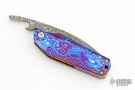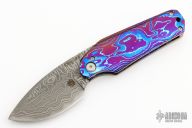 This Friction Folder by EDC Lion features a San Mai Damascus blade with false top edge. The handle has a mokuti frame and backspacer. Comes with a brown leather pocket sheath with Ulti-clip. Excellent condition.