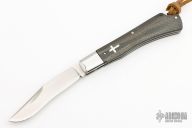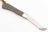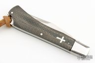 This Trapper Slipjoint by Wendell Halfmann features a hand rub satin finished blade with nail nick. The handle has stainless steel bolsters and liners, CPM154 steel spring and carbon fiber covers with a stainless steel escutcheon. Has half-stop, flush in all positions. Includes a padded zippered case.  New from Maker!