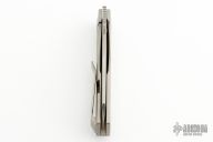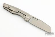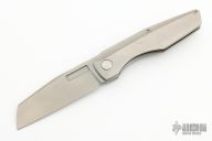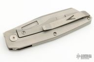 This Axon First Run Folder by Vero Engineering features a stonewash finished blade with notched thumbrest and thumbhole. The handle has a bead blasted titanium frame with stainless steel lockface incert, tip up clip with hidden screws, titanium backspacer. Rides on bearings, nice detent, lockup and blade seating. #979