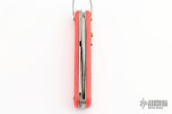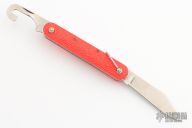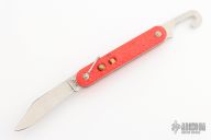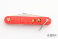 This knife by Camillus features a clip point blade. The handle has orange jigged scales, stainless steel liners and backspacer. Has Safety. Has some patina, otherwise the knife is in excellent condition.